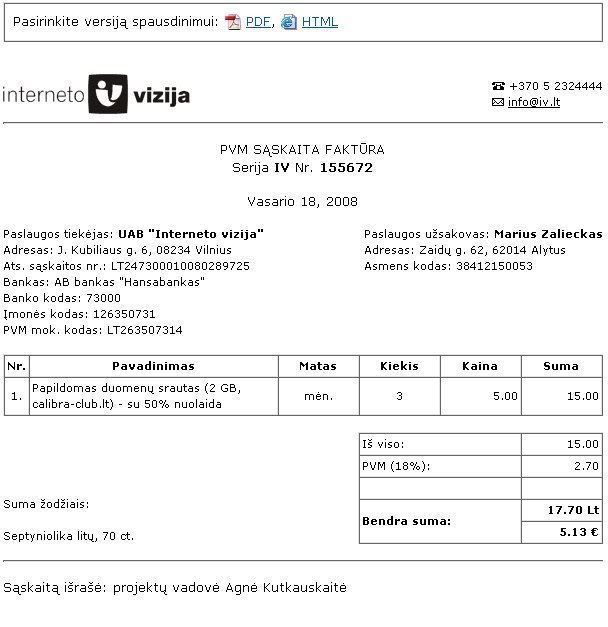 Gavom dar saskaitele uz papildoma srauta 17.70Lt (Apmokejau)